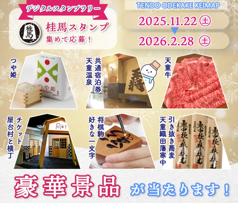 マップ掲載のスポットを巡ってスタンプを集めると、つや姫や天童温泉共通宿泊券などの豪華景品に応募できます!